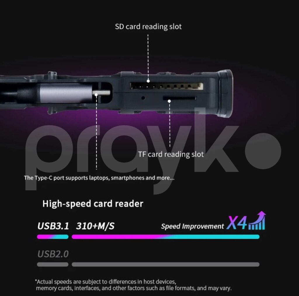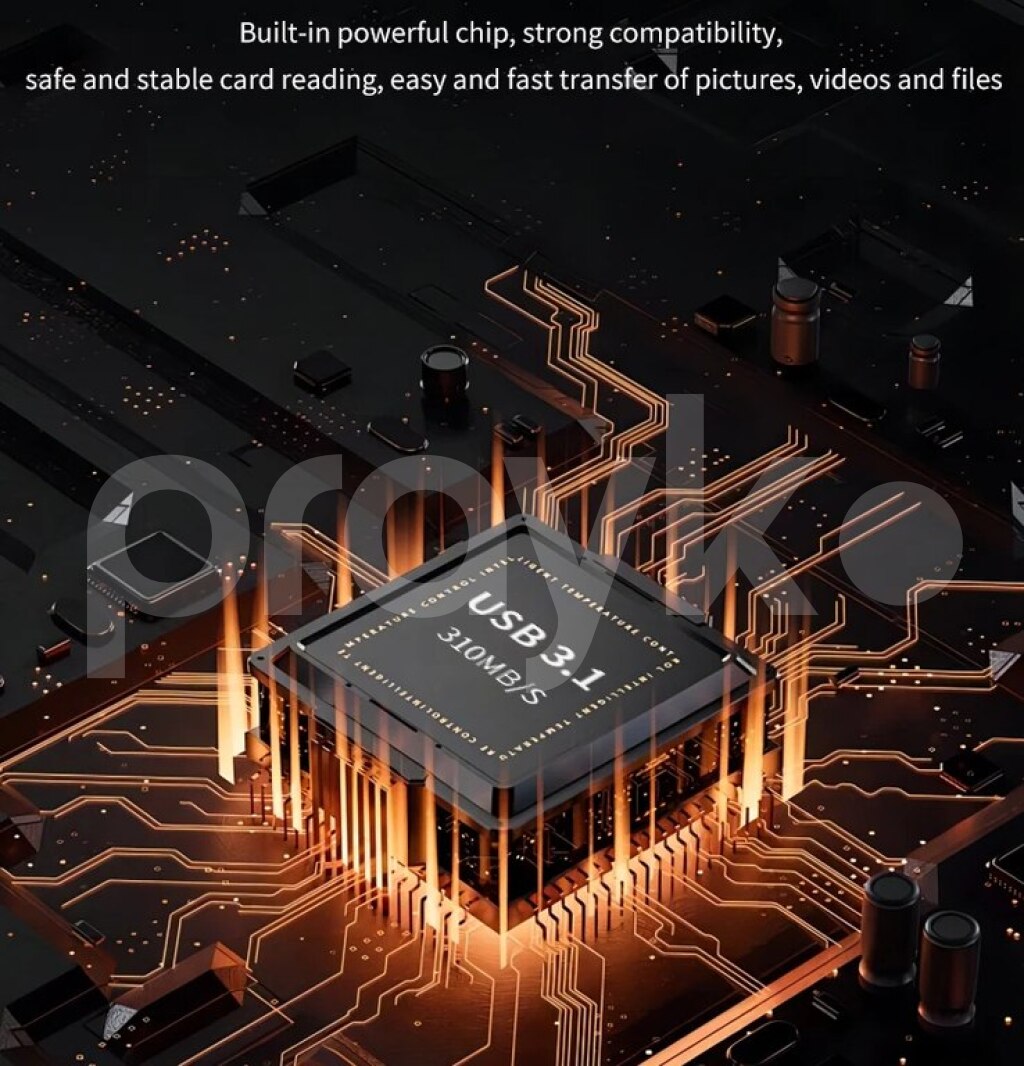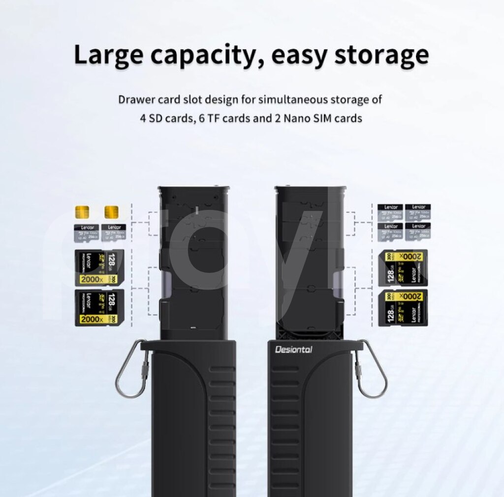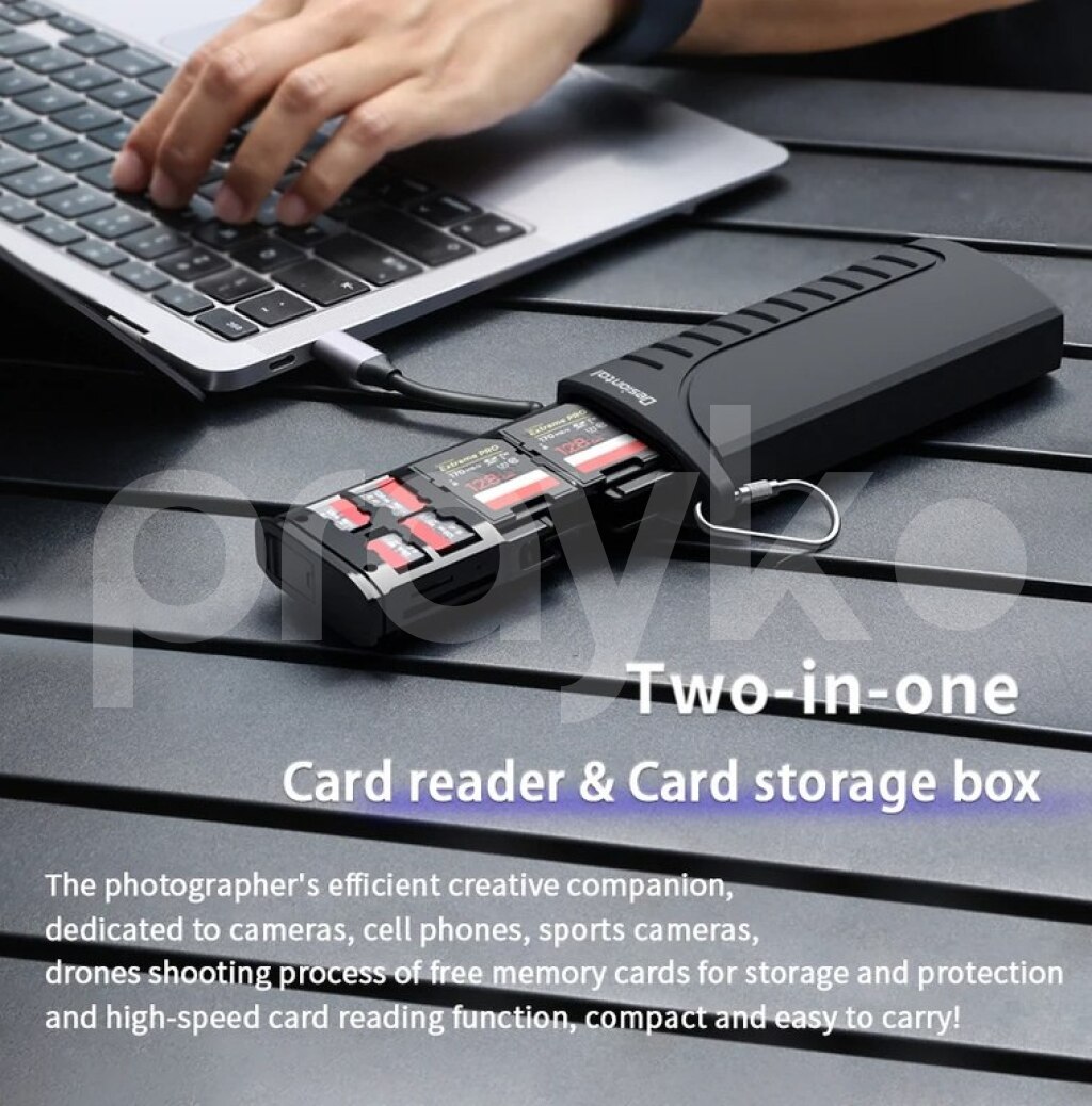endirim 95azn yox !!! Desiontal firmas;nın sürətli kart readeri və bir neçə kart növlərini qutu kimi saxalamq üçündür.Bir neçə yuvası var. Desiontal DK-10 High-Speed SD Card Reader USB 3.1 Type-C SD/TF/SIM Card Carrying Case for Cameras, Smartphones, Drones Устройство для чтения SD-карт памяти USB 3,1 Type-C. Features: • Double as a high-speed card reader and a memory card protective case. • With a built-in USB 3.1 chip, the transmission speed is up to 310MB/S; • SD and TF dual card slots support data transfer at the same time; • Can store SD card*4,TF card*6, Nano SIM card*2 • Suitable for cameras, smartphones, drones, action cameras users; • Made of aluminum-alloy shaped at one go; • IP54 protection; Compatibility Devices: Cameras, smartphones, drones, action cameras • Memory Cards: Compatible with UHS-Ⅱ,SD 4.0 Norm: UHS-II, SDXC, SDHC, SD Cards UHS-I, SDXC, SDHC, SD Cards UHS-ll, Micro SDXC, Micro SDHC, Micro SD Cards UHS-l, Micro SDXC, Micro SDHC, Micro SD Cards Systems: Windows 7/10/11 and above, Mac OS 10 and above, Linux, Android,iPad OS. Note: Data transfer only applies to Type-C port phones and tablets that support OTG; To connect with a desktop computer, a Type-C to USB-A adapter is required.