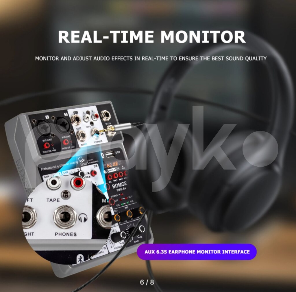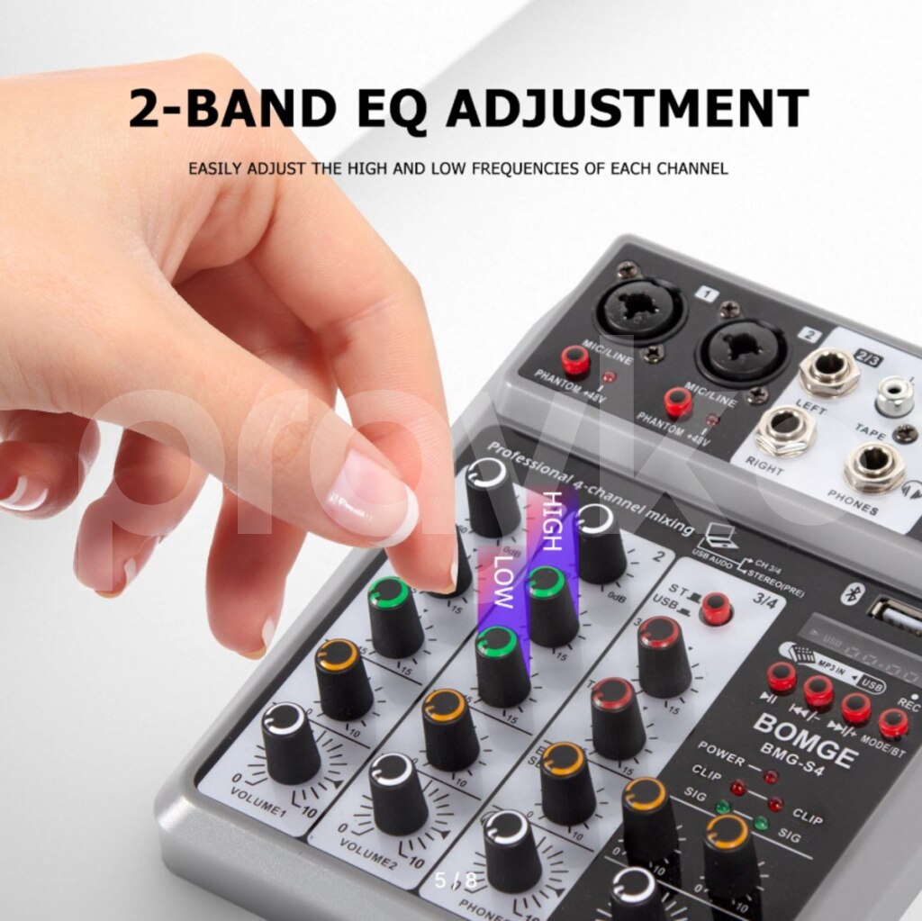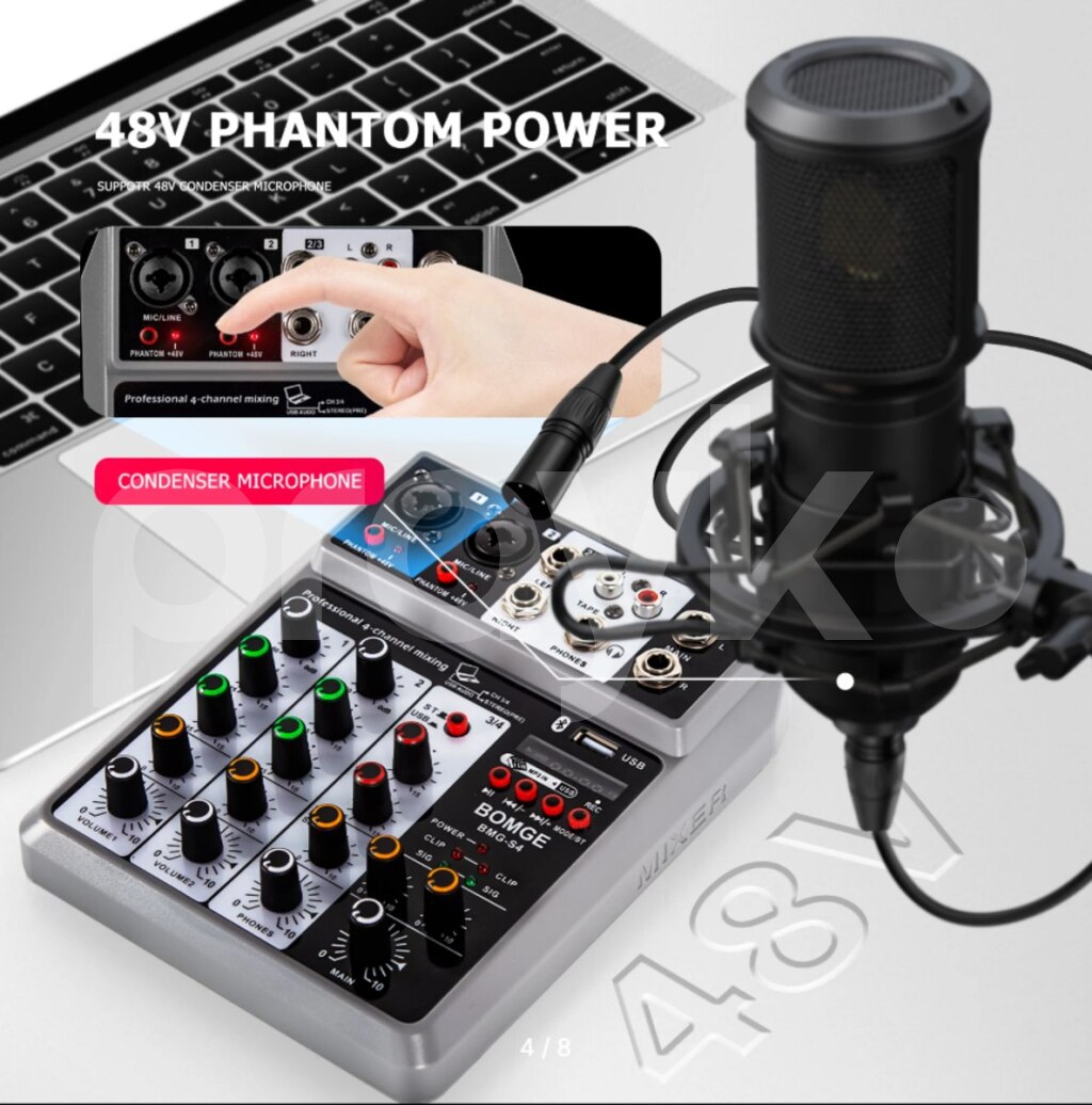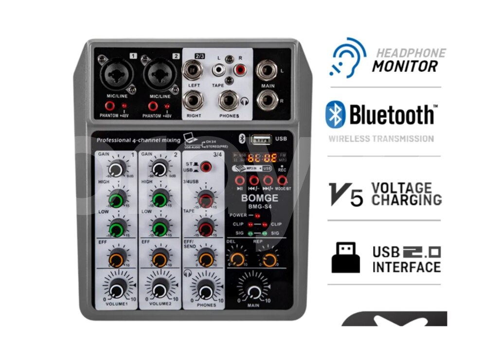 Mini Mixer Phantom 48V Mini mixer daşına bilən.Phantom 48V mikrafonları dəstəkliyir. BOMGE S4 Профессиональный 4-канальный аудиомикшер. BOMGE Professional 4 channel Audio Mixer Sound Board Mixing Console Digital USB Bluetooth Echo Delay Effect Input 48V Phantom USB-A Interface for Music Playback/Recording Easily connect your USB stick to mix and play your MP3 music on this sound mixer. It is also possible to record audio output to a USB stick. Bluetooth Wireless Connection Wirelessly stream music from Pad, Phone, Tablets, Computer, and other Bluetooth devices with ease. This DJ mixer comes with built-in controls such as Play/Pause/switch songs and Modes and Bluetooth works within 1.5ft. 48V Phantom Power The sound mixer have 3 XLR inputs with phantom power.you can feel free to switch 48V phantom power and the audio mixer has ultra-low noise enables to be used with condenser microphone. EQ/Gain Controls/Echo and Delay Effect With highly accurate LED Peak Level Indicator, onboard 2-band EQ, and gain controls, this mixer can easily adjust the high and low frequencies of each channel. Plus, you can add delay or echo effects to your mix, making it perfect for live streaming, podcasting, small band shows, network anchoring, ZOOM meetings, weddings and much more. Mic Line + Stereo Line Inputs The Mini Mixing Console is great for multiple devices connectivity.2 XLR Lines input jack to connect mics or guitar, 1 pair L/R 6.35mm and 1 pair L/R RCA stereo inputs to connect CD plays/keyboard/computer. Plus 1 pair L/R 6.35mm Main output to connect Active Speakers/Power Amplifier/Active sound system/Trolley Active Speaker.(Note: It is not possible to connect an output device with Bluetooth, and it can only be compatible with active) Headphone monitor This mixing board comes with a 6.35mm headphone jack that allows you to plug in headphones at any time to monitor the sound and volume.